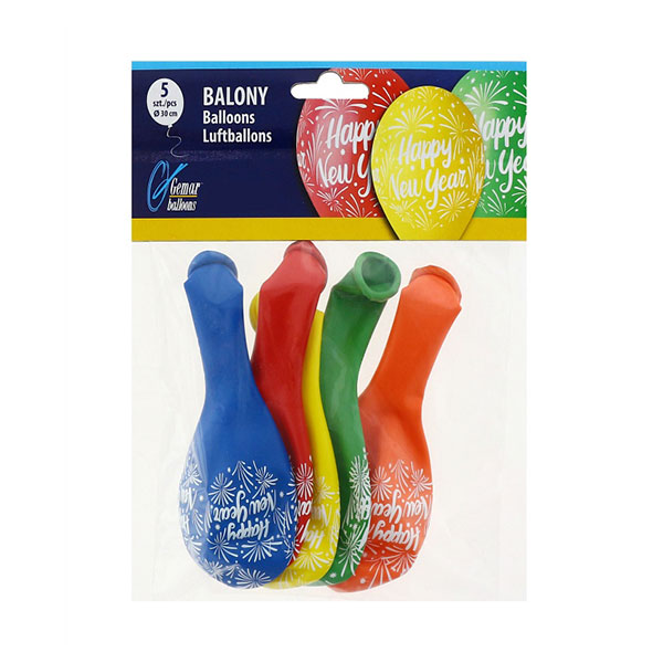 W zestawie znajduje się 5 kolorowych balonów – niebieski, czerwony, pomarańczowy, żółty i zielony. Każdy z nich ozdobiony jest stylowym nadrukiem „Happy New Year”, który doda energii i radości Twojej imprezie.