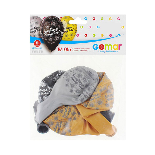 Balony sylwestrowe z polskim nadrukiem „Szczęśliwego Nowego Roku” to idealna dekoracja na powitanie Nowego Roku! W zestawie 6 sztuk w kolorach złotym, srebrnym i czarnym.