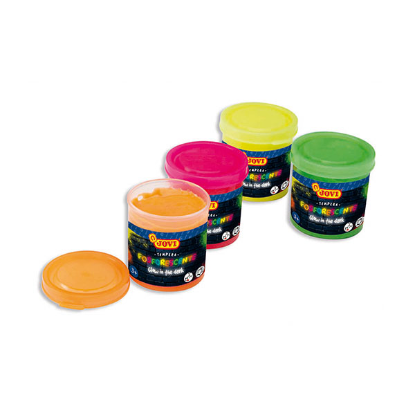 Zestaw 4 fluorescencyjnych farb JOVI (4×55 ml), które świecą w ciemności! Intensywne kolory, szybkoschnące, gotowe do użycia od razu po otwarciu. Idealne do malowania pędzlem, gąbką lub wałkiem.