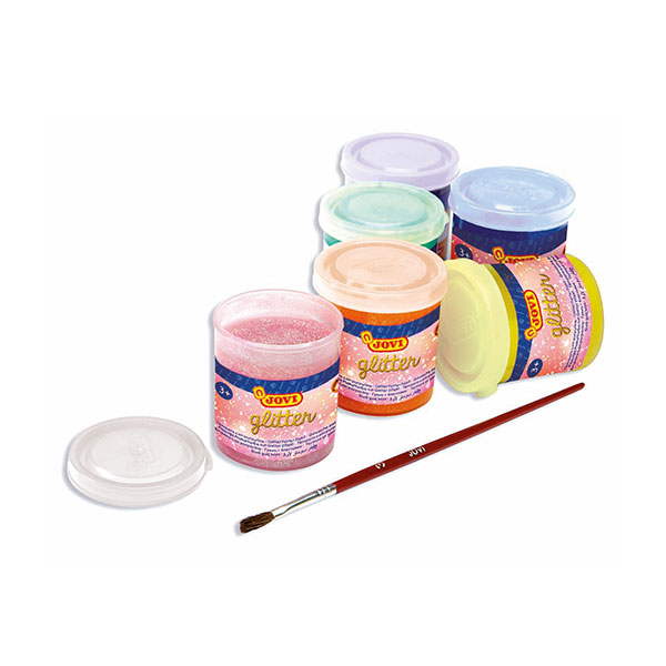 Brokatowe farby plakatowe JOVI – zestaw 6 błyszczących kolorów (55 ml). Idealne do szkoły i zabawy w domu. Pokrywają papier, karton, drewno i glinę. Szybko schną, pięknie się mienią i nie łuszczą!