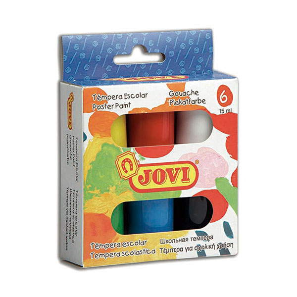 Farby szkolne JOVI – zestaw 6 intensywnych kolorów (6×15 ml). Gotowe do użycia, szybkoschnące, nietoksyczne. Idealne do szkoły, przedszkola i zajęć plastycznych. Można malować pędzlem, wałkiem, gąbką lub szpatułką.