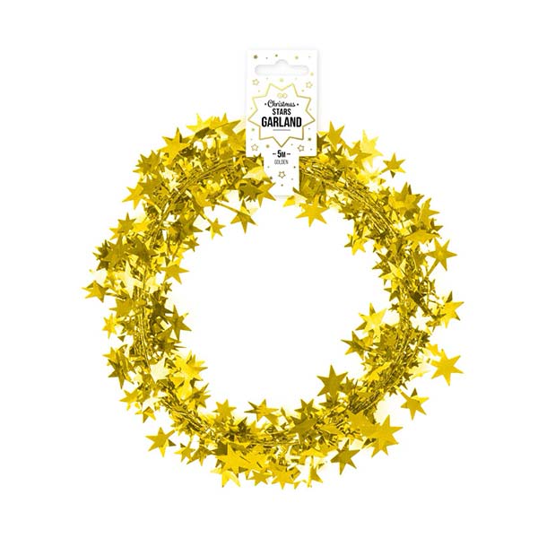 Błyszcząca girlanda z złotych gwiazdek – 5 metrów świątecznego blasku! Foliowe gwiazdki o wysokości do 3 cm tworzą lekką, efektowną dekorację na ściany, okna, choinkę, witryny i tła zdjęciowe.