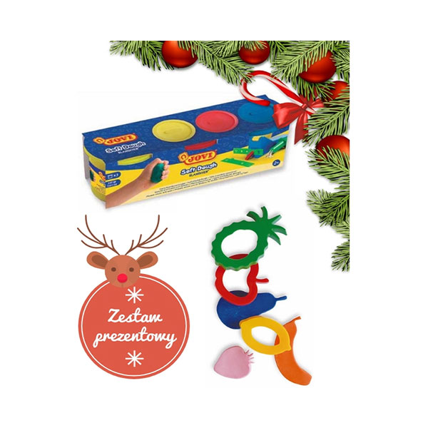 Świąteczny zestaw prezentowy z foremkami w kształcie owoców i kolorową ciastoplastoliną JOVI. Gotowy do wręczenia, zapakowany w piękne opakowanie prezentowe – idealny prezent pod choinkę!