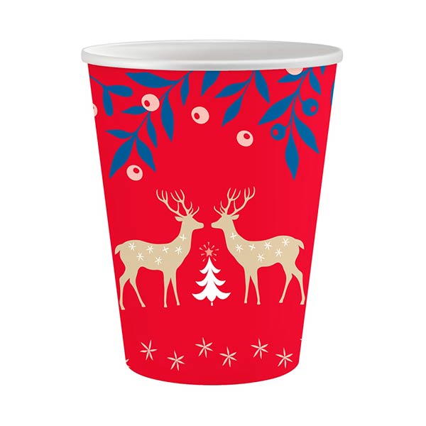 Świąteczne kubki papierowe – 6 sztuk. Klasyczny, jednorazowy kubeczek z bożonarodzeniowym zdobieniem – idealny na Wigilię klasową, firmową i domowe spotkania przy choince.