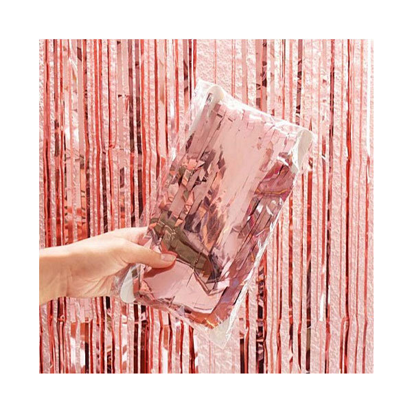 Błyszcząca kurtyna foliowa w kolorze różowego złota (100 × 200 cm). Idealna na urodziny, domowe party, sylwestra oraz jako ścianka foto. Lekka, łatwa w montażu, wielorazowa.