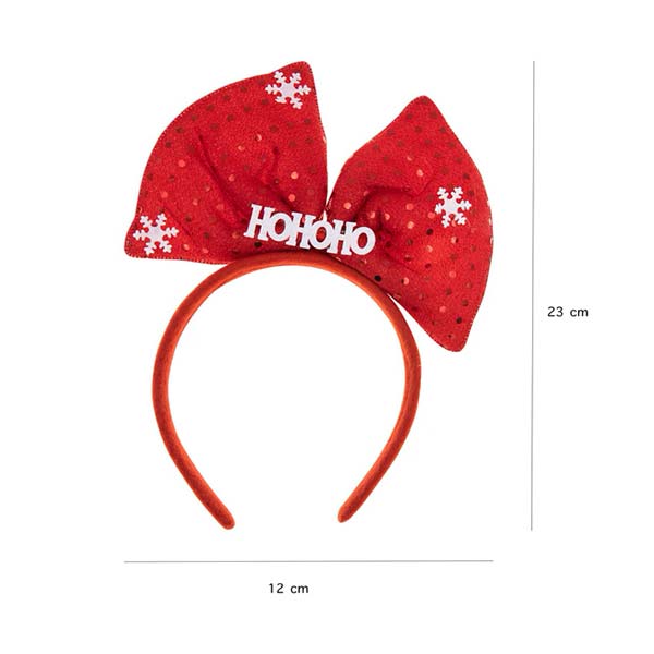 Błyszcząca opaska „Ho Ho Ho” z czerwoną kokardą, cekinami i płatkami śniegu. Idealny dodatek na Mikołajki, jasełka, klasowe Choinki i spotkania opłatkowe. Na żywo wygląda jeszcze piękniej – prawdziwy efekt „wow”!