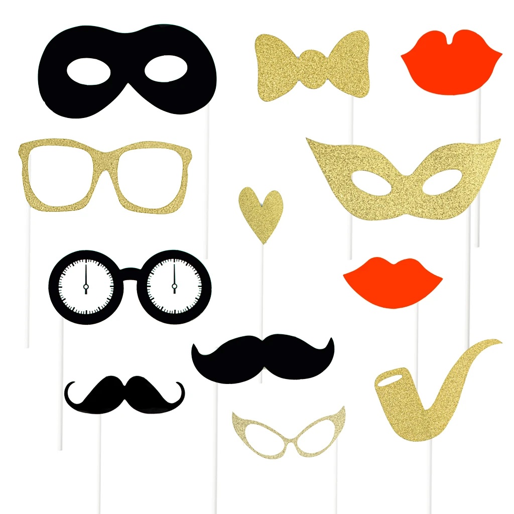 Elegancki, złoty zestaw foto-gadżetów, który doda blasku każdej imprezie: bal, sylwester, karnawał, urodziny czy rocznica. Usta, wąsy, okulary i inne kształty – wszystko na patyczkach, gotowe do pozowania!