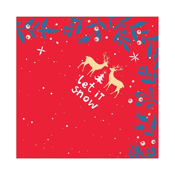 Świąteczne serwetki 33×33 cm z napisem „Let it snow!” i zimowym motywem. Opakowanie 20 sztuk – praktyczne i stylowe do wigilijnego stołu, klasowej Wigilii i domowych spotkań.