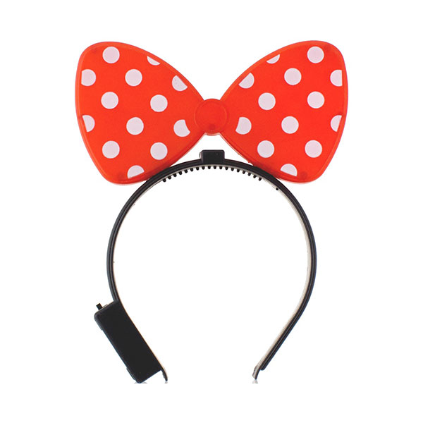 Stylowa opaska z dużą, czerwoną kokardą w białe grochy. Wbudowane diody LED sprawiają, że świeci i przyciąga wzrok! Idealna na imprezy, Sylwestra, zabawy karnawałowe i animacje dla dzieci.